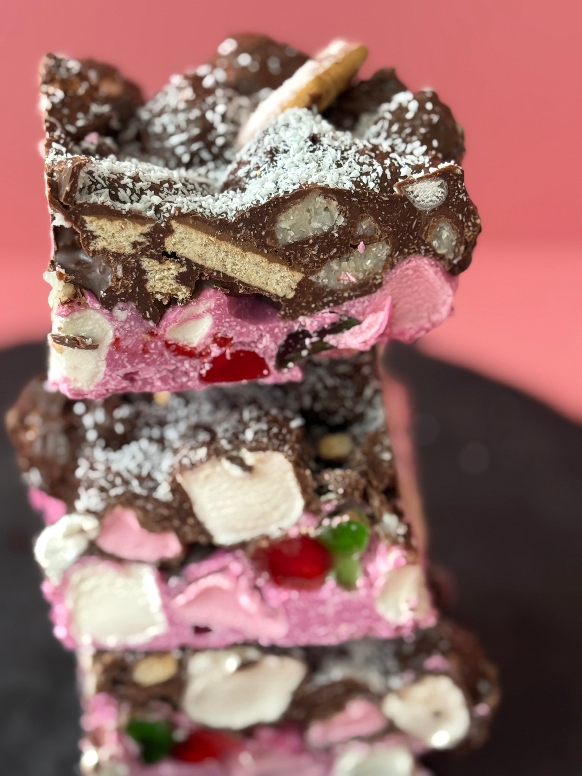 Lamington is our rocky road spin on the beloved Aussie classic. Featuring Iced Vovos, coconut and strawberry gummies in a creamy white chocolate (tinted pink) bottom layer, topped with a layer of rich dark chocolate filled with Bounty, coconut, digestive biscuits and more coconut - it captures all the flavours of a traditional lamington in every bite. A nostalgic favourite reimagined, this special release is part of our Aussie Favourites range, available throughout January π¦πΊπ₯₯
